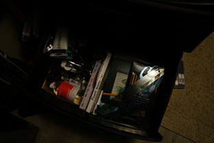 I have several sketch books full or empty, I keep all of them in a drawer as well as art supplies to stay organised. Drawers are portable and roll for ease of use.